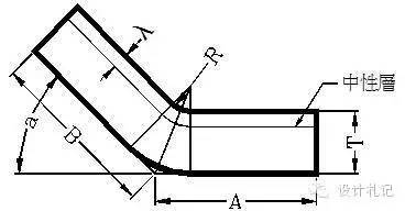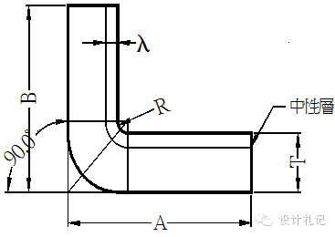 板料在彎曲過(guò)程中外層受到拉應(yīng)力,內(nèi)層受到壓應(yīng)力,從拉到壓之間有一既不受拉力又不受壓力的過(guò)渡層--中性層,中性層在彎曲過(guò)程中的長(zhǎng)度和彎曲前一樣,保持不變,所以中性層是計(jì)算彎曲件展開長(zhǎng)度的基準(zhǔn).中性層位置與變形程度有關(guān),當(dāng)彎曲半徑較大,折彎角度較小時(shí),變形程度較小,中性層位置靠近板料厚度的中心處,當(dāng)彎曲半徑變小,折彎角度增大時(shí),變形程度隨之增大,中性層位置逐漸向彎曲中心的內(nèi)側(cè)移動(dòng).中性層到板料內(nèi)側(cè)的距離用λ表示。