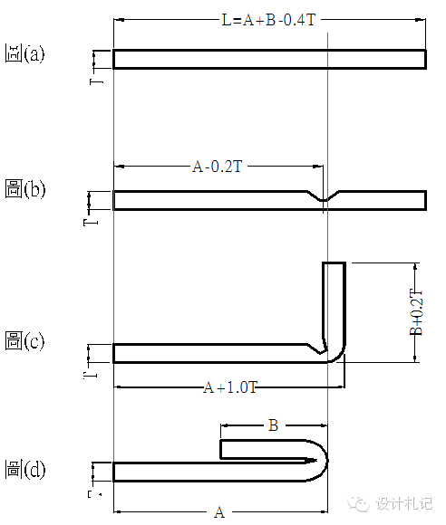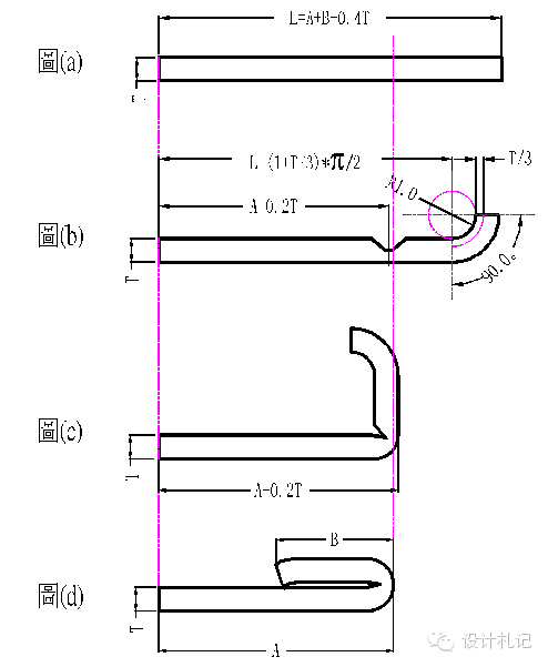 4.13側(cè)沖壓平 圖(a): 展開長(zhǎng)度 L=A+B-0.4T 圖(b): 壓線位置尺寸 A-0.2T 圖(c): 90°折彎處尺寸為A+1.0T 圖(d): 側(cè)沖壓平后的產(chǎn)品形狀 | ||
