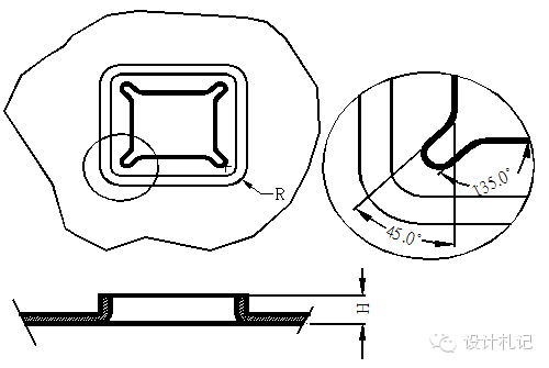 4.9 方形抽孔 方形抽孔,當(dāng)抽孔高度較高時(shí)(H>Hmax),直邊部展開與彎曲一致, 圓角處展開按保留抽高為H=Hmax的大小套彎曲公式展開,連接處用45度線及圓角均勻過(guò)渡, 當(dāng)抽孔高度不高時(shí)(H≦Hmax)直邊部展開與彎曲一致,圓角處展開保留與直邊一樣的偏移值. 以下Hmax取值原則供參考. 當(dāng)R≧4MM時(shí): 材料厚度T=1.2~1.4取Hmax =4T 材料厚度T=0.8~1.0取Hmax =5T 材料厚度T=0.7~0.8取Hmax =6T 材料厚度T≦0.6取Hmax =8T 當(dāng)R<4MM時(shí),請(qǐng)示上級(jí). | ||
