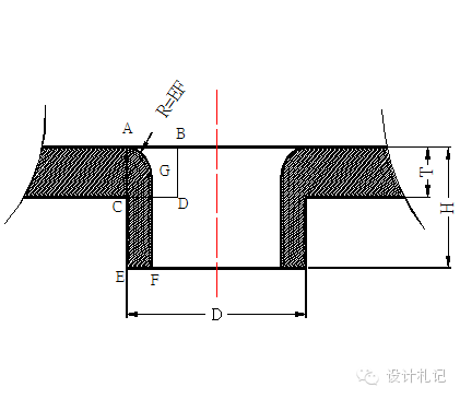 4.8 抽芽 抽芽孔尺寸計(jì)算原理為體積不變?cè)?/span>,即抽孔前后材料體積不變;ABCD四邊形面積=GFEA所圍成的面積. 一般抽孔高度不深取H=3P(P為螺紋距離),R=EF見(jiàn)圖 ∵ T*AB=(H -EF)*EF+π*(EF)2/4 ∴ AB={H*EF+(π/4-1)*EF2}/T ∴預(yù)沖孔孔徑=D – 2AB T≧0.8時(shí),取EF=60%T. 在料厚T<0.8時(shí),EF的取值請(qǐng)示上級(jí). | ||